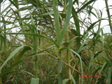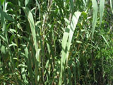 Giant reed is a tall, perennial grass that can grow to over 20 feet in height. Its fleshy, creeping rootstocks form compact masses from which tough, fibrous roots emerge that penetrate deeply into the soil. Leaves are elongate, 1-2 inches wide and a foot long. The flowers are borne in 2-foot long, dense, plume-like panicles during August and September.