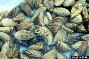 Impact: Zebra and quagga mussels are highly invasive, small freshwater mussels that multiply rapidly and can cause tremendous environmental and economic damage. Their larvae are microscopic, and the adults are usually less than 1 1/2 inches long. Zebra and quagga mussels are usually found in large clusters and usually have a zebra-like striped pattern on their shells. Zebra mussels will lie flat on a smooth surface on their hinge side, unlike quagga and native mussels. Once invasive mussels become established in a water body, they are impossible to eradicate with the technology currently available.