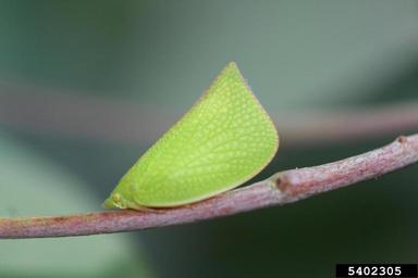 Adult Description: Adult Torpedo Bugs (Siphanta acuta) are bright green in color with veins along their dorsal side mimicking a leaf. Their eyes are pink and the head comes to point, giving this insect a torpedo shape and an aerodynamic structure. The wingspan of the adult Torpedo bug is about 25mm. Once in the adult stage, life expectancy of S. acuta is only around 2 months.