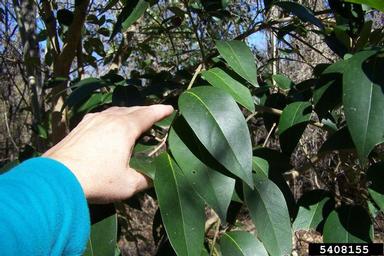 Fruit. Also illustrates the narrow, translucent margins of the leaves. The leaves are also not as thick and tough (robust) at the leaves of Japanese privet (Ligustrum japonicum).